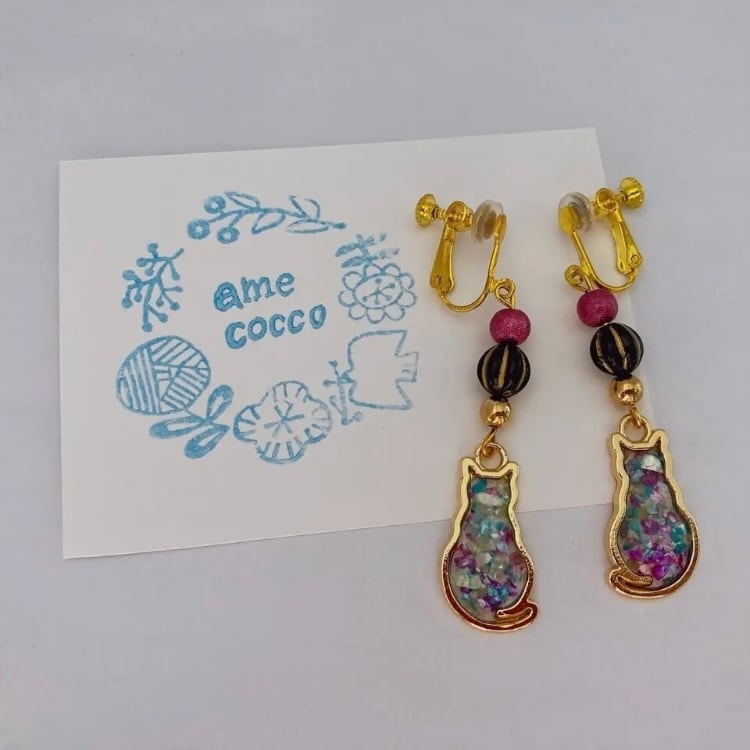 ビーズとネコ型のレジンで作ったイヤリングです。